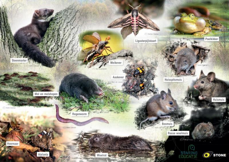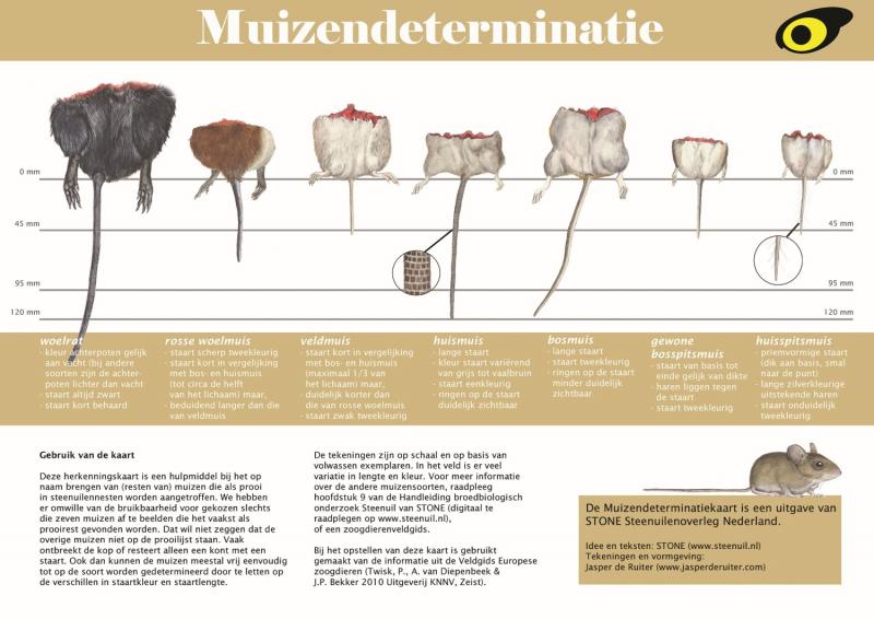 De muizendeterminatiekaart is een handig, tweezijdig bedrukte geplastificeerde kaart op A4-formaat om in het veld de belangrijkste muizenprooien in steenuilennesten snel op naam te brengen. Een kont-met-staart volstaat om de juiste eigenaar te determineren.